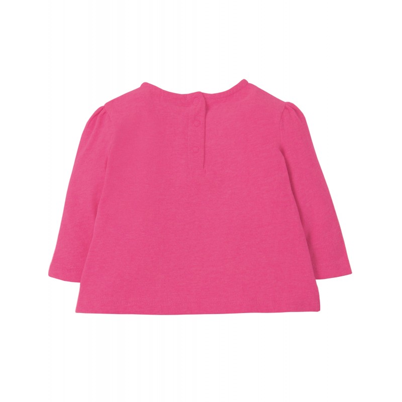 Maglia manica lunga in cotone biologico interlock, morbido ed avvolgente, con una simpatica e colorata applique a contrasto. Chiusura con bottoncini dietro il collo. Maniche con un leggero sbuffo sulla spalla.