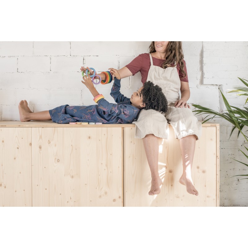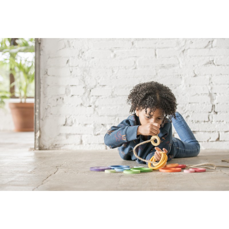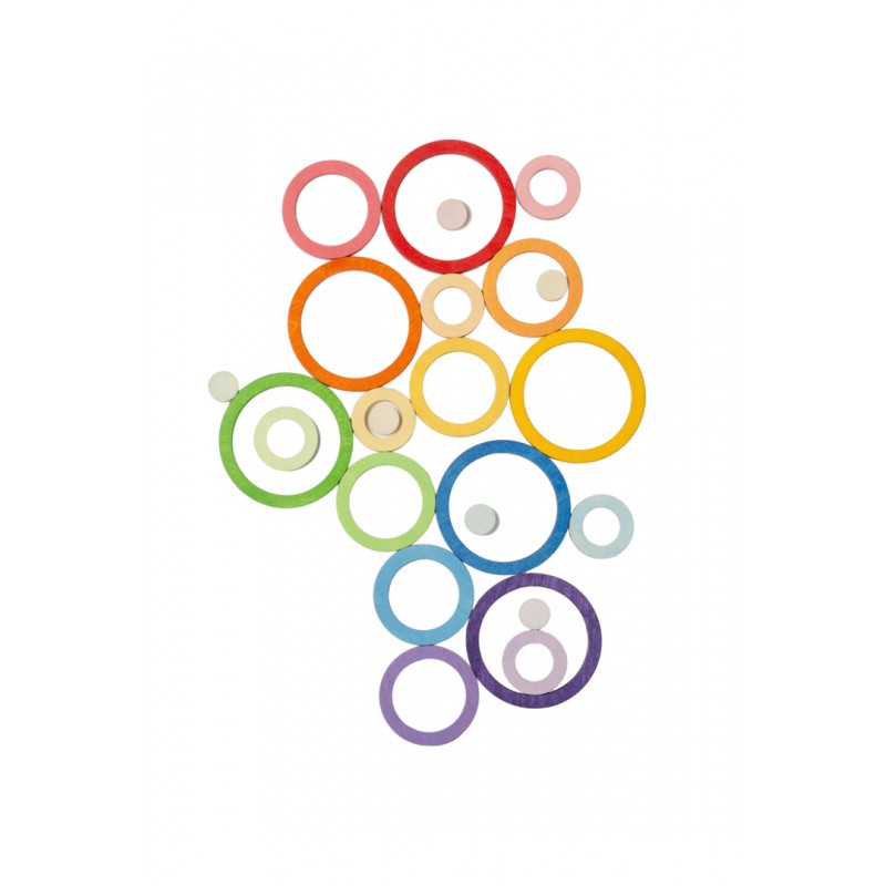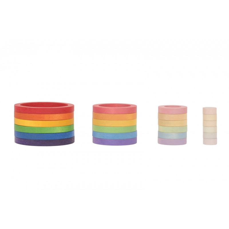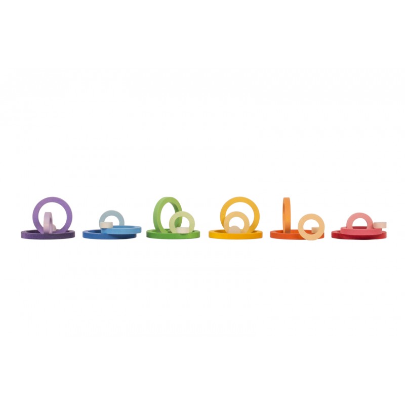 24 anelli nido in quattro diverse dimensioni e in 6 colori sfumati. Ogni colore contiene 4 anelli nella sfumatura della sua tonalità, dalla più vivace alla più leggera. Questo gioco si presta a tantissime varianti, con infili, accatastamenti, raggruppamenti e creazione di giochi diversi.