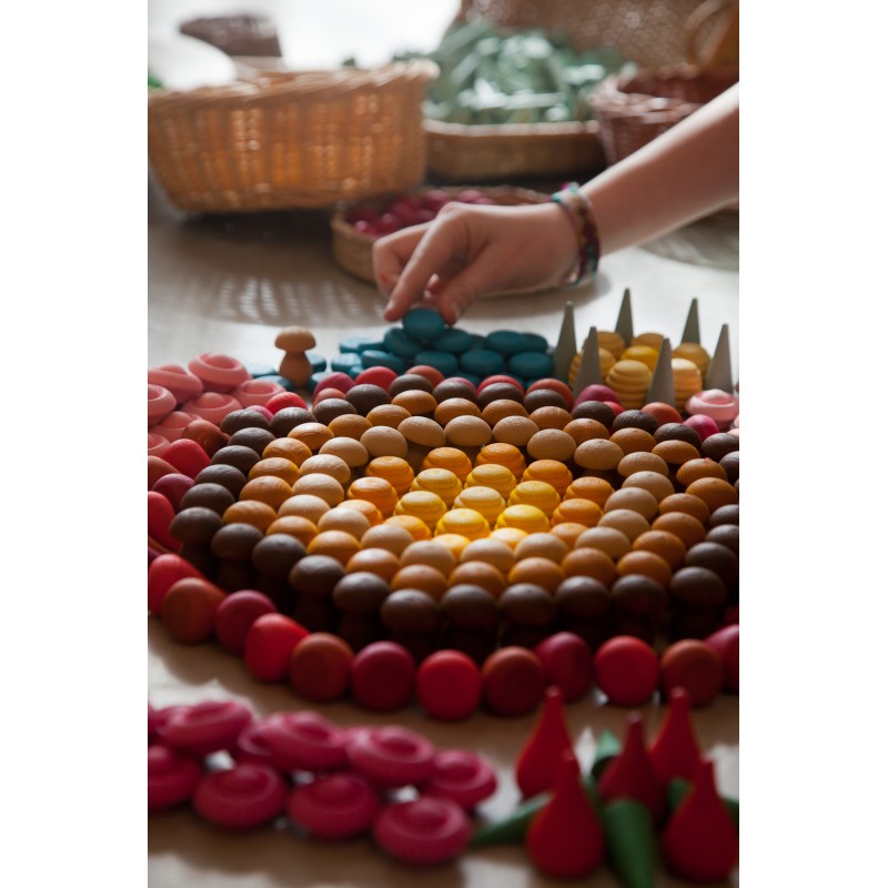 36 funghetti in legno, realizzate e colorate artigianalmente: un materiale sciolto da proporre ai bambini. Perfetto per realizzare mandala e disegni.