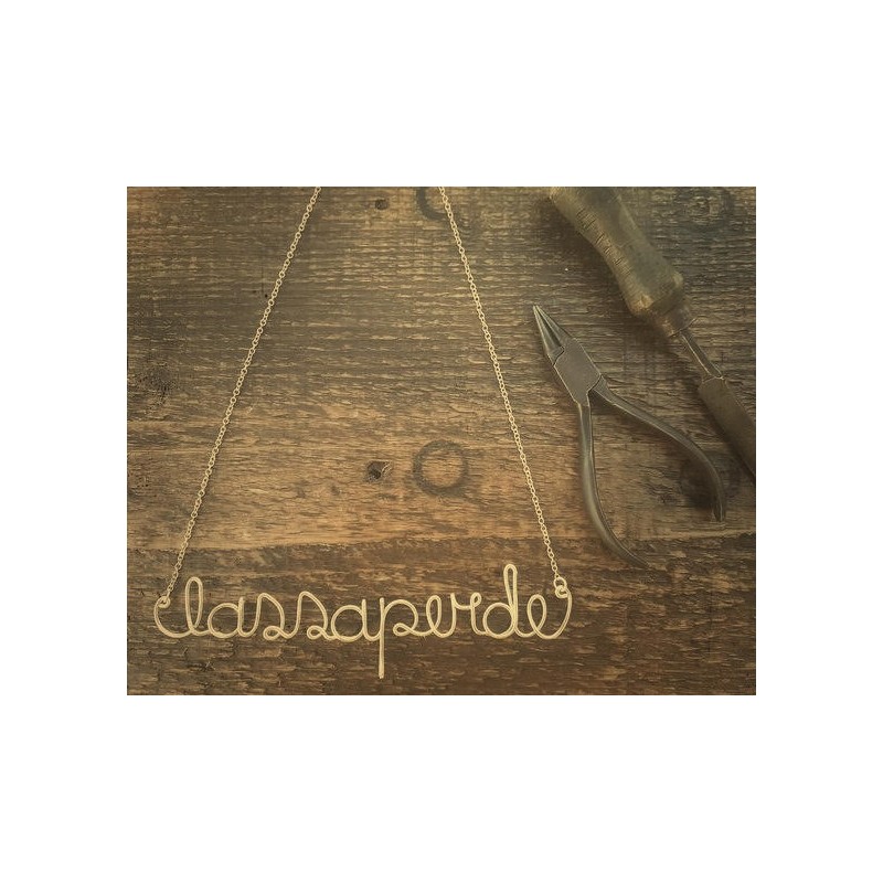 Collana interamente realizzata a mano con filo di ottone (spessore 1 mm), lavorato per creare scritte ironiche e irriverenti.