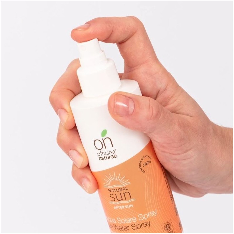 Sai cos'è un'acqua solare? È un prodotto che contiene diversi principi attivi capaci di rinfrescare, idratare, calmare il rossore che può trasformare la tua tintarella in un incubo! L'Acqua Solare Spray della nuova linea di solari e doposole onSUN Officina Naturae, è proprio questo: un prodotto che contiene un mix di estratti biologici come Carota e Avena, che alleviano la sensazione di eccessivo calore durante l'esposizione al sole e donano al tuo corpo un'abbronzatura omogenea, intensa e naturale, allontanando il rischio di anti-estetiche macchie della pelle.