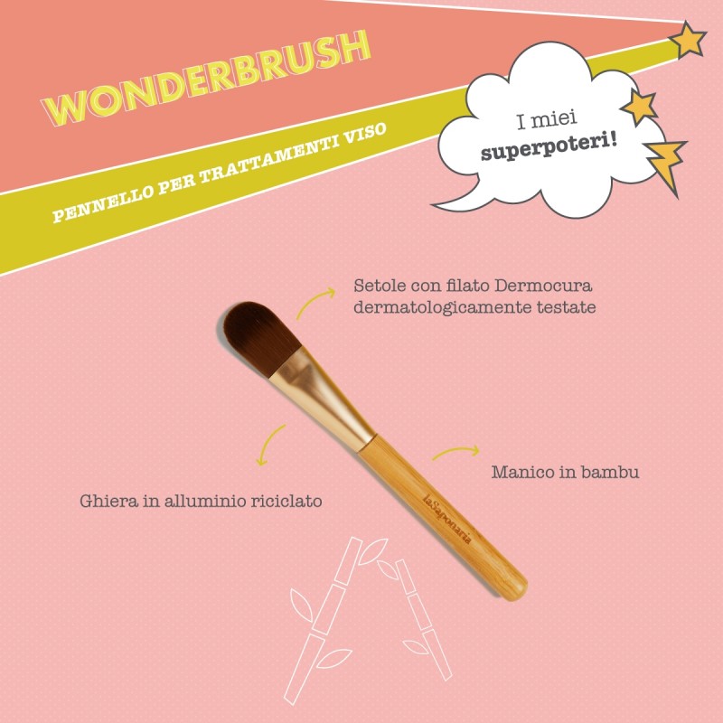 Wonderbrush è un pennello a lingua di gatto ideale per stendere le maschere Wonder Pop e non solo! Potrai utilizzarlo con tutte le maschere in crema, di argilla e perfino le BB Cream!